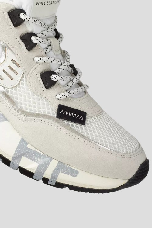Детали: Мужские бело-серые кроссовки из замши и текстиля от Voile Blanche (Вуаль Бланш). Комбинация цветов и материалов, логотип на язычке и на пятке, классическая шнуровка, петля для подтягивания сзади, закругленный носок, брендированная подошва