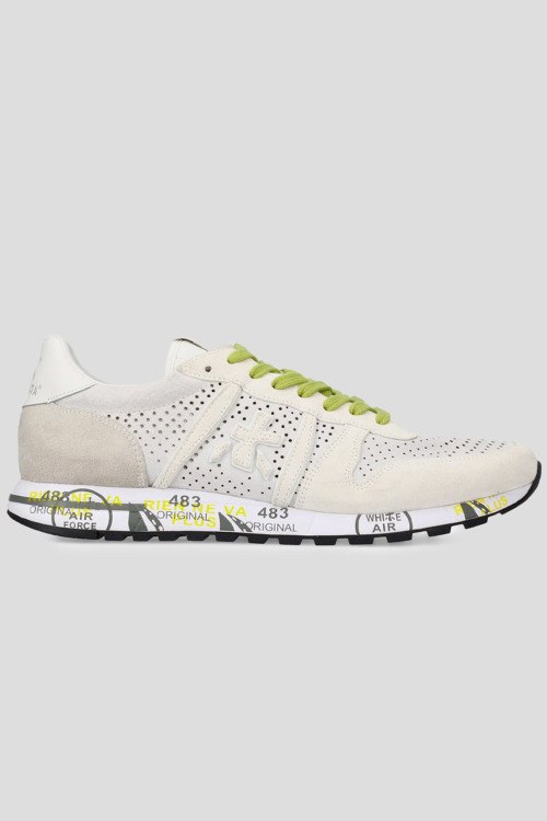 Детали: Мужские белые кроссовки Eric из натуральной замши от Premiata (Премиата). Закругленный носок, перфорированный дизайн, спереди классическая шнуровка контрастного цвета, контрастные вставки, рельефная подошва, патч-лого