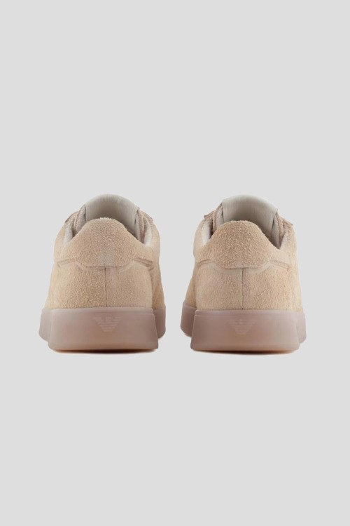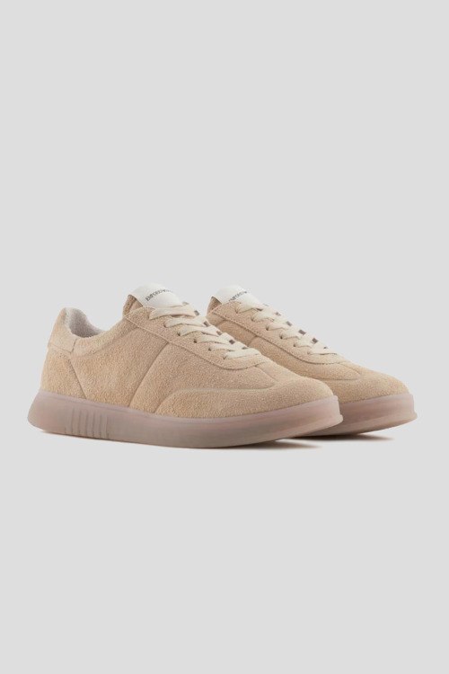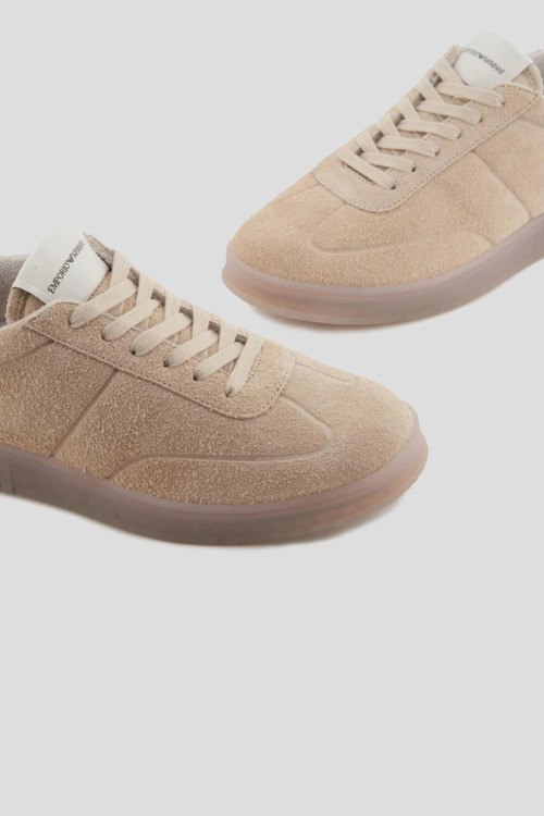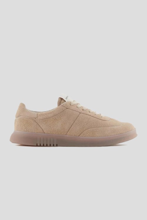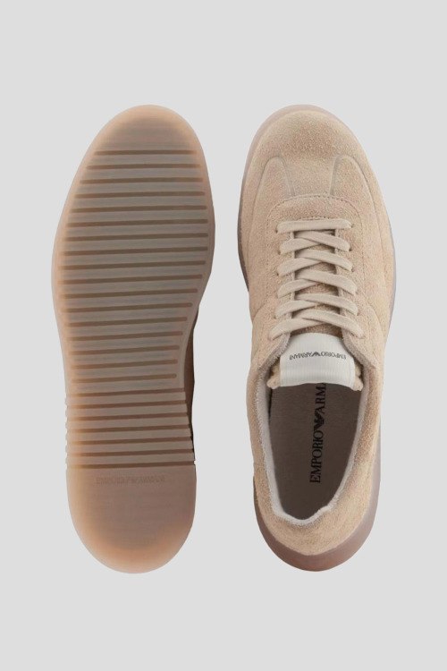 Детали: Мужские бежевые замшевые кроссовки от Emporio Armani (Эмпорио Армани). Логотип на язычке, классическая шнуровка, закругленный носок, подошва в тон изделия