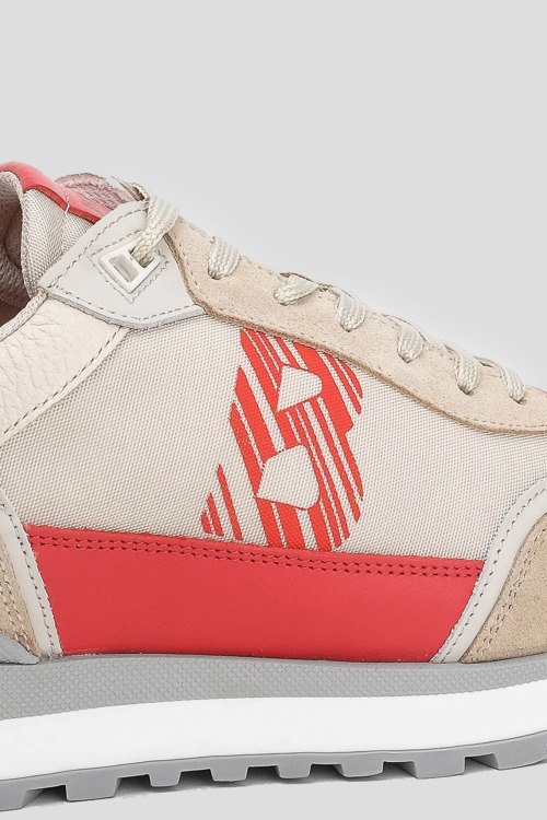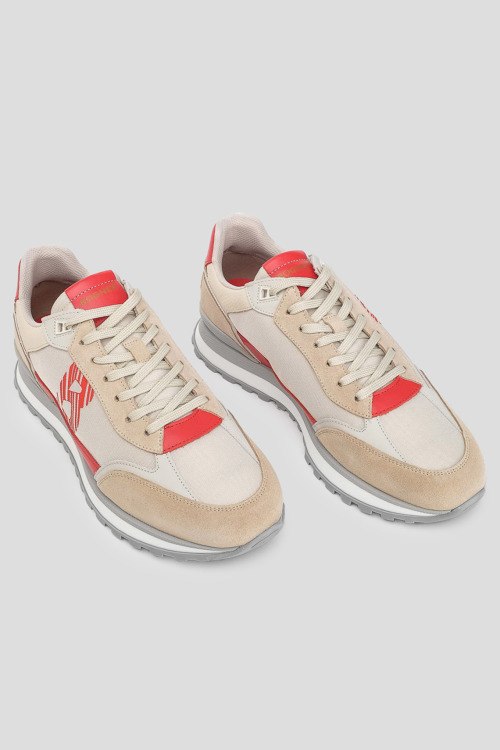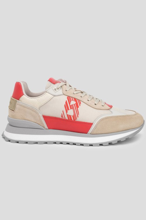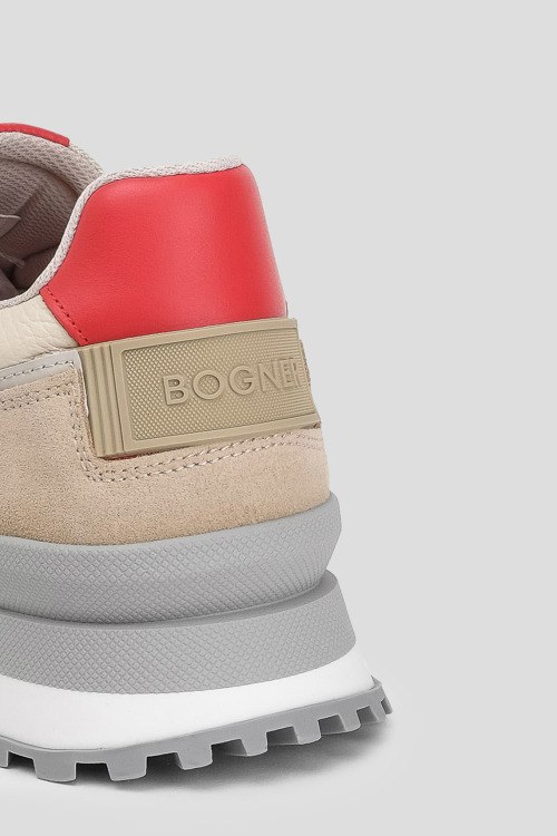 Детали: Мужские бежевые кроссовки из замши и текстиля Newport от Bogner (Богнер). Комбинация цветов и материалов, логотип сбоку и на язычке, классическая шнуровка, закругленный носок, бело-серая подошва