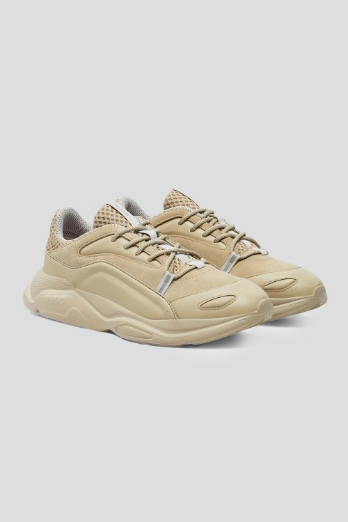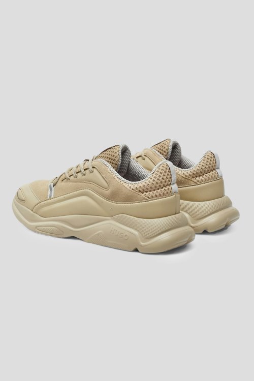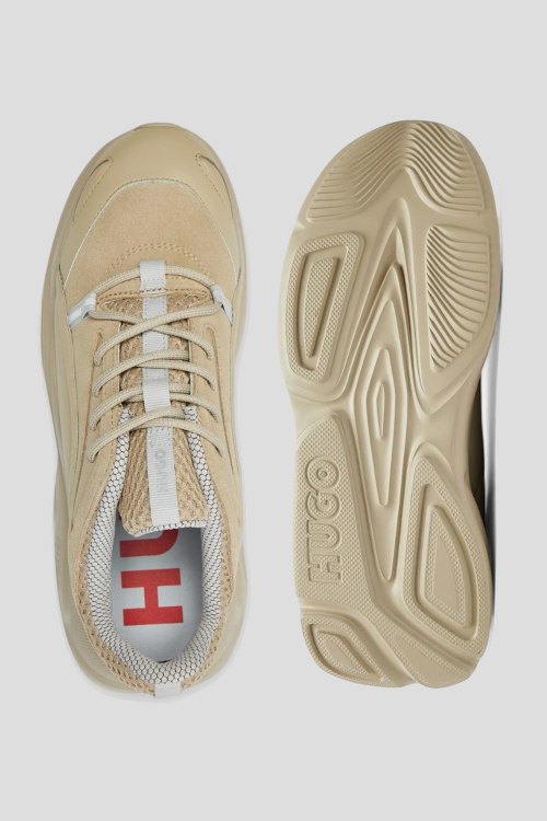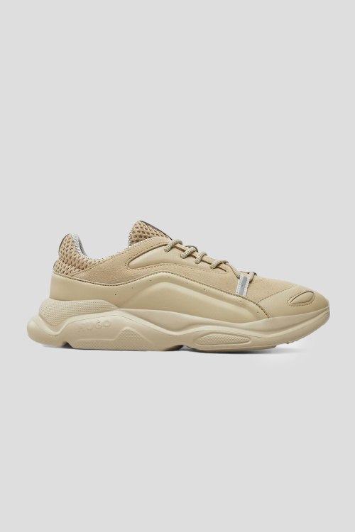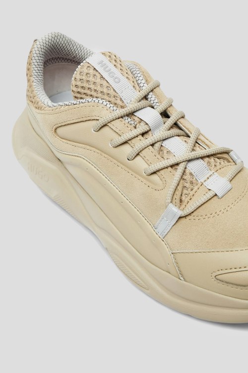 Детали: Мужские бежевые кроссовки из кожи и замши Leon Runn от Hugo by Hugo Boss (Хуго бай Хуго Босс). Комбинация материалов, классическая шнуровка, закругленный носок, брендированная подошва