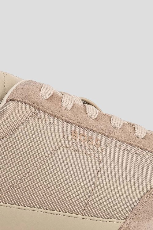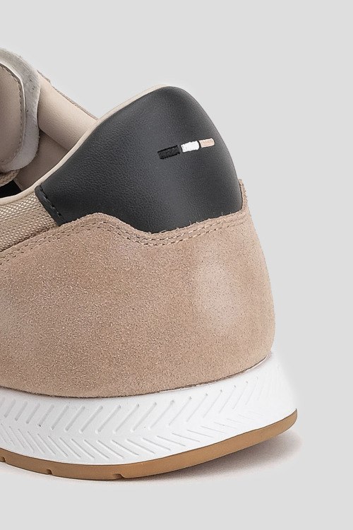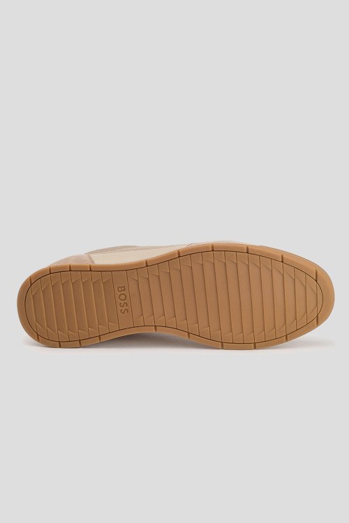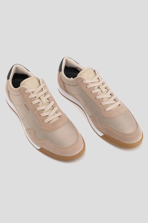 Детали: Мужские бежевые кроссовки Titanium из текстиля и замши от Hugo Boss (Хуго Босс). Комбинированный дизайн, закругленный носок, спереди классическая шнуровка, логотип бренда, рельефная подошва