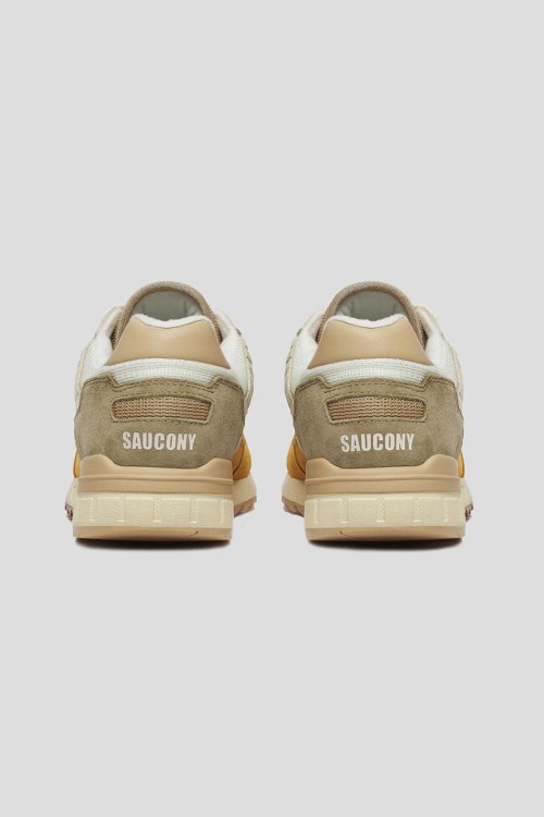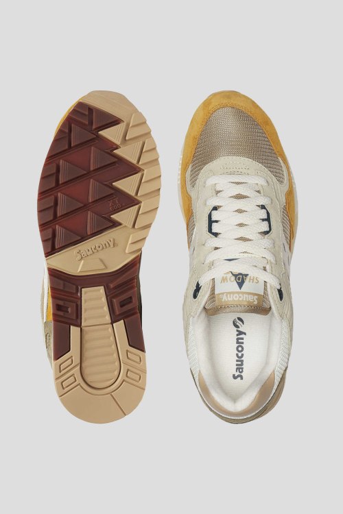 Детали: Мужские бежевые кроссовки из замши и текстиля Shadow 5000 от Saucony (Сайкони). Комбинация цветов и материалов, логотип сбоку и на язычке, классическая шнуровка, закругленный носок, резиновая подошва
