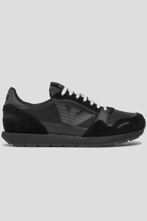 Мужские черные кроссовки из текстиля и замши от Emporio Armani (Эмпорио Армани). Закругленный носок, дизайн в виде комбинации материалов, патч-лого, спереди классическая шнуровка, рельефная подошва