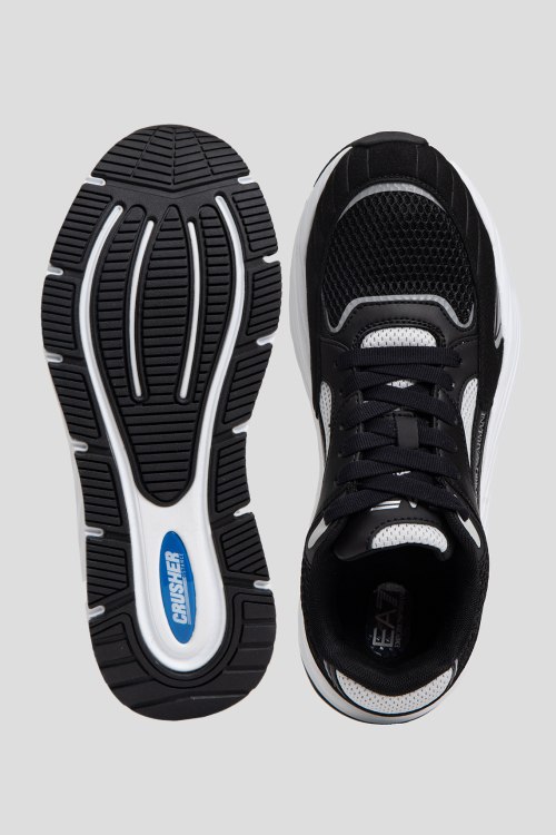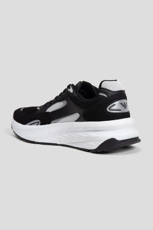 Детали: Мужские черные кроссовки из текстиля и экокожи от Armani (Армани). Комбинированный дизайн, закругленный носок, спереди классическая шнуровка, логотип бренда, массивная подошва