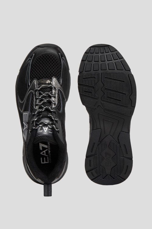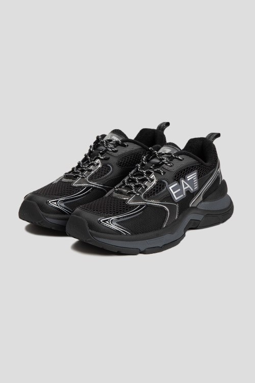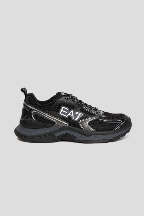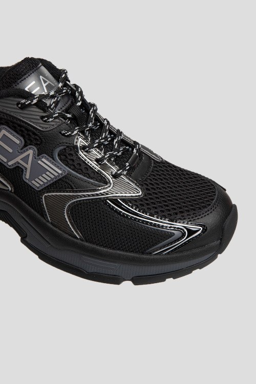 Детали: Мужские черные текстильные кроссовки от EA7 Emporio Armani (ЕА7 Эмпорио Армани). Вставки из полиуретана, логотип сбоку и на язычке, классическая шнуровка, петля лоя подтягивания сзади, закругленный носок