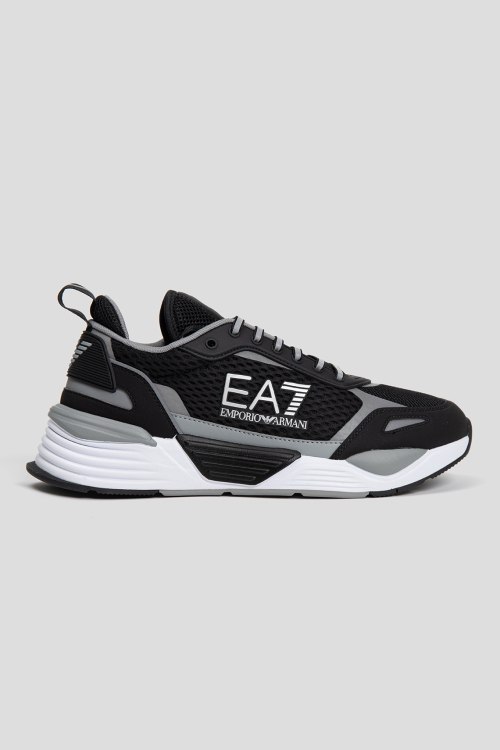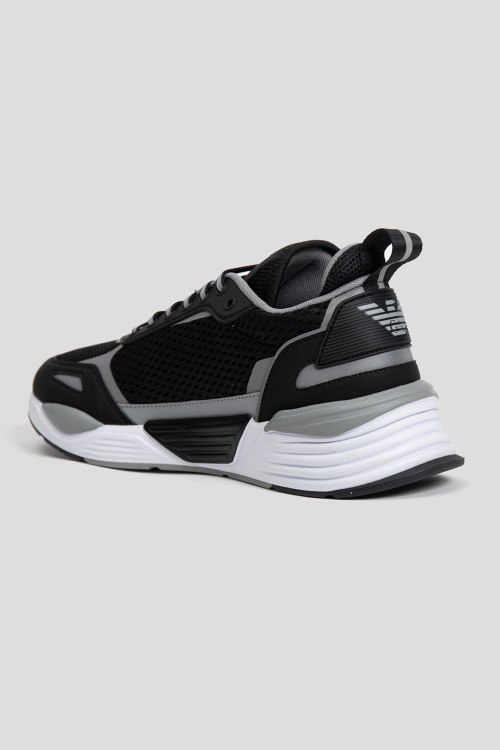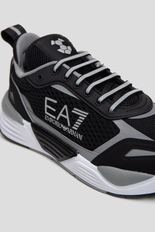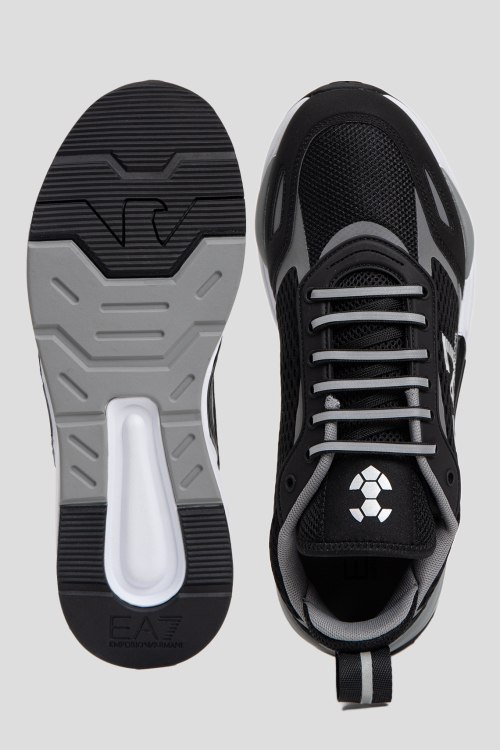 Детали: Мужские черные кроссовки из текстиля и экокожи от Armani (Армани). Комбинация цветов, материалов, логотип бренда, петля для подтягивания, текстильная подкладка