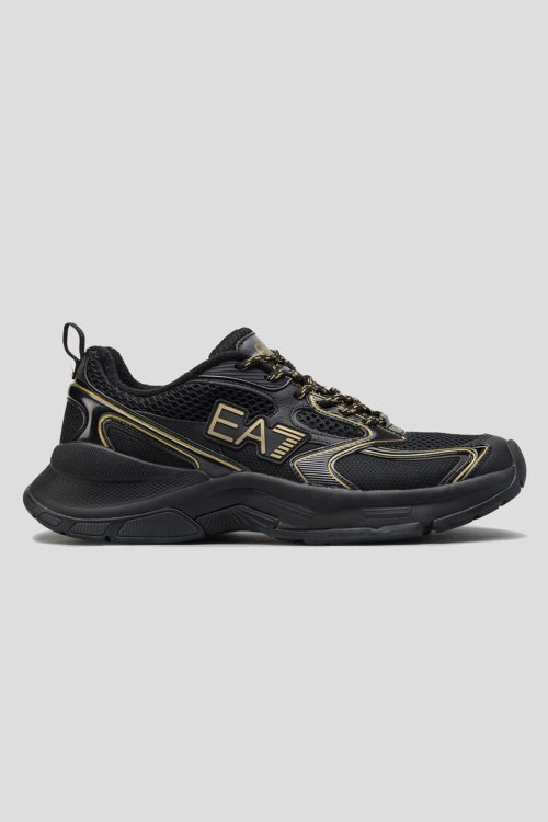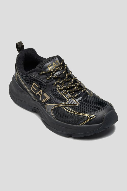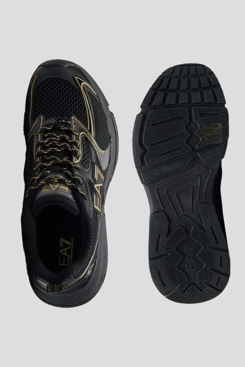 Детали: Мужские черные кроссовки из текстиля и кожи от EA7 Emporio Armani (ЕА7 Эмпорио Армани). Комбинация цветов и материалов, логотип сбоку и на язычке, классическая шнуровка, петля для подтягивания сзади, закругленный носок