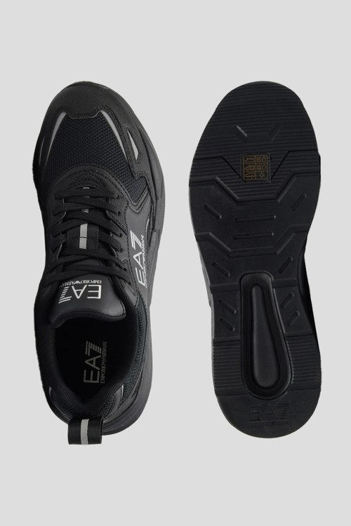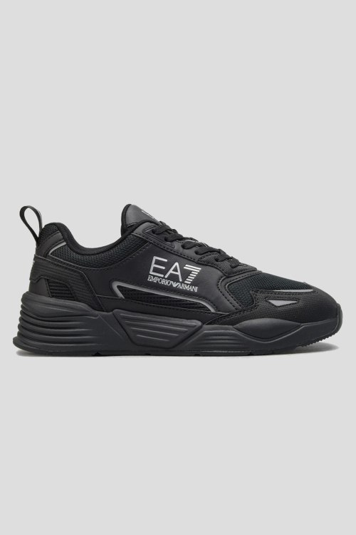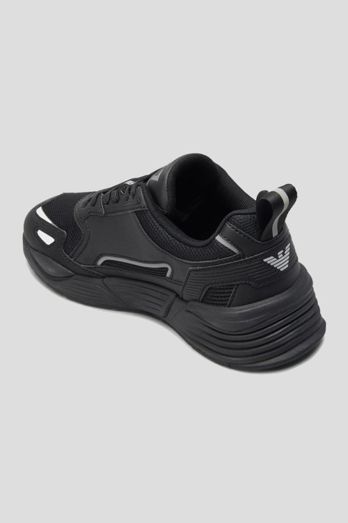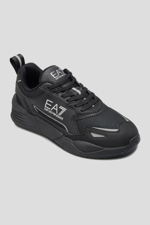 Детали: Мужские черные кроссовки из текстиля и экокожи от EA7 Emporio Armani (ЕА7 Эмпорио Армани). Комбинация материалов, логотип сбоку и на язычке, классическая шнуровка, петля для подтягивания сзади, закругленный носок