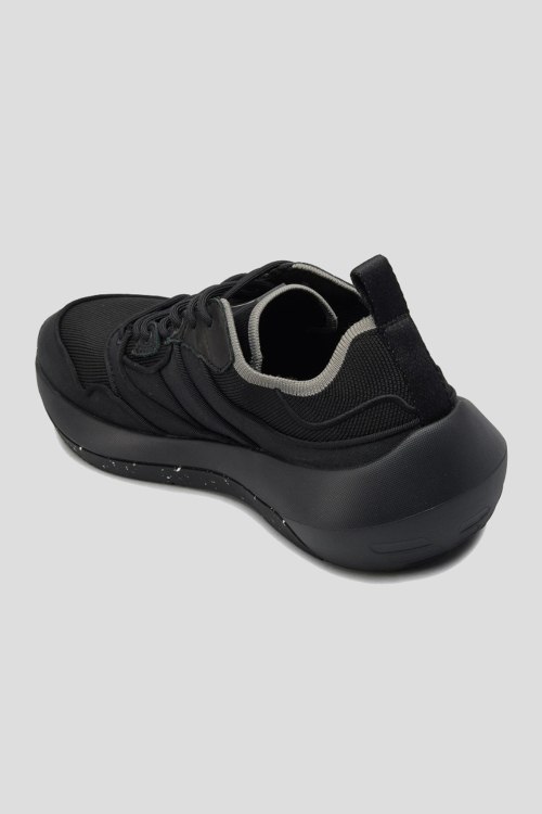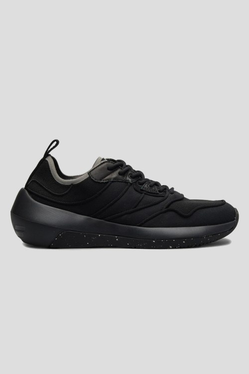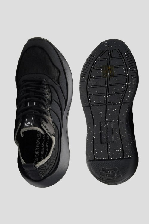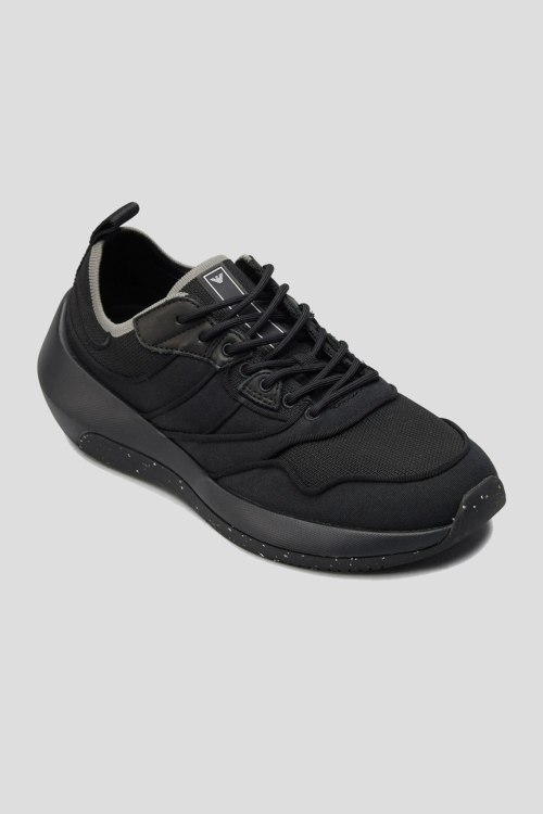 Детали: Мужские черные текстильные кроссовки от Emporio Armani (Эмпорио Армани). Комбинация материалов, логотип на язычке, классическая шнуровка, петля для подтягивания сзади, закругленный носок
