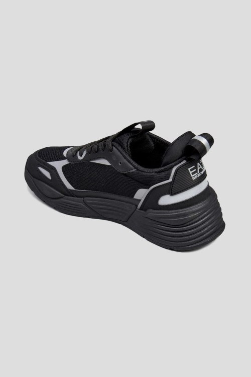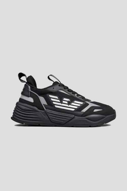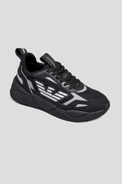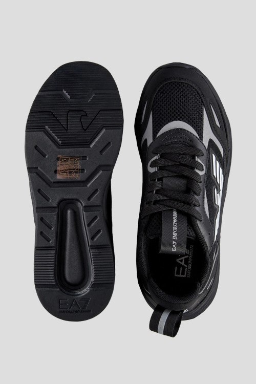 Детали: Мужские черные кроссовки из экокожи и текстиля от EA7 Emporio Armani (ЕА7 Эмпорио Армани). Комбинация цветов и материалов, логотип сбоку и на язычке, классическая шнуровка, две петли для подтягивания, закругленный носок