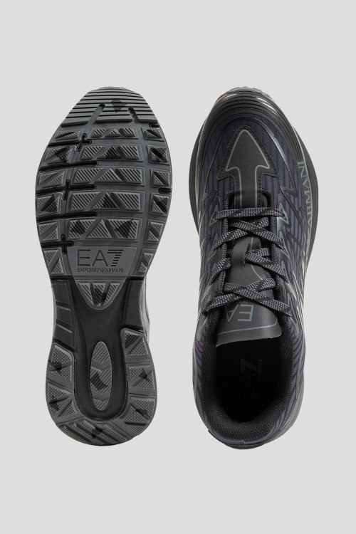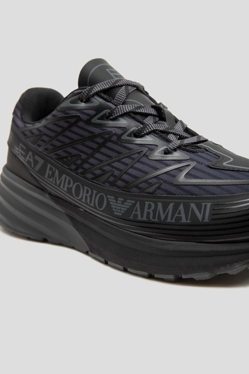 Детали: Мужские черные кроссовки из текстиля и экокожи от Armani (Армани). Комбинация материалов, закругленный носок, спереди шнуровка, логотип бренда, резиновая подошва, текстильная стелька