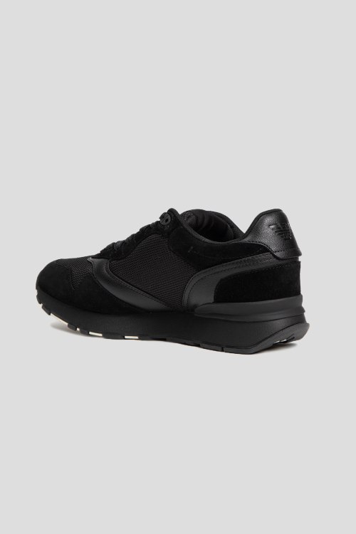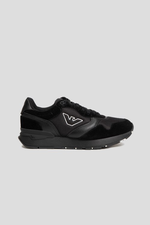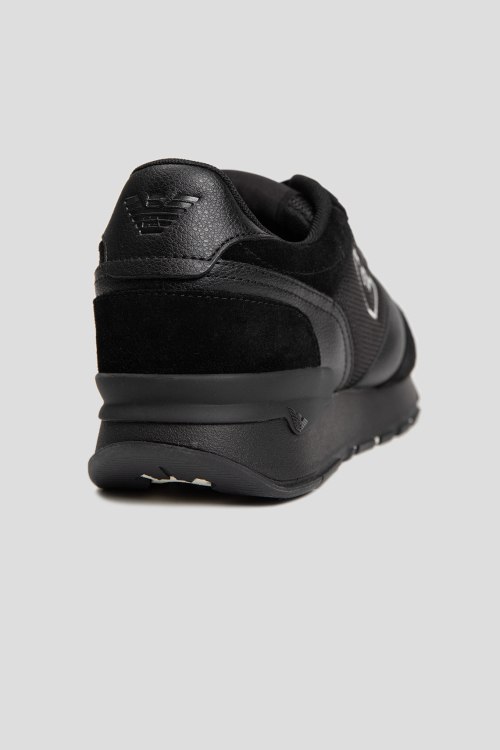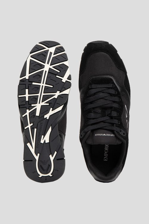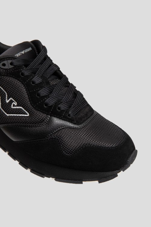 Детали: Мужские черные кроссовки из замши и текстиля от Emporio Armani (Эмпорио Армани). Комбинация материалов, логотип сбоку и на язычке, классическая шнуровка, закругленный носок, резиновая подошва