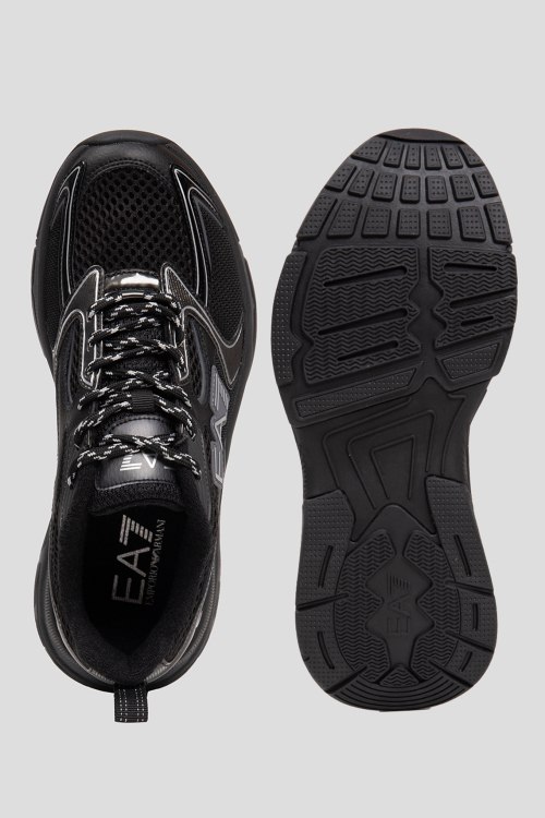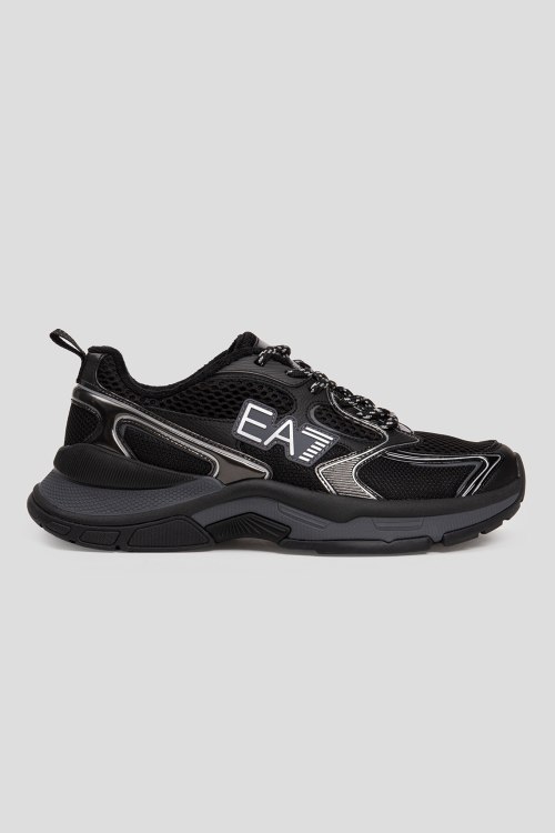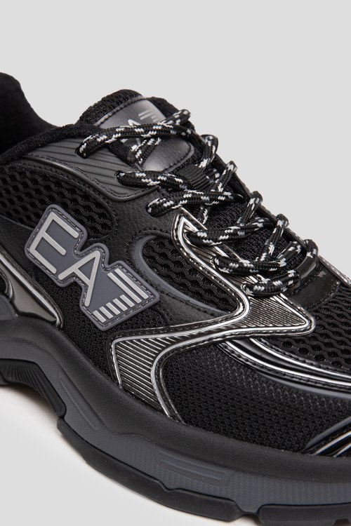 Детали: Мужские черные текстильные кроссовки от EA7 Emporio Armani (ЕА7 Эмпорио Армани). Комбинация материалов, логотип сбоку и на язычке, классическая шнуровка, петля для подтягивания сзади, закругленный носок, резиновая подошва