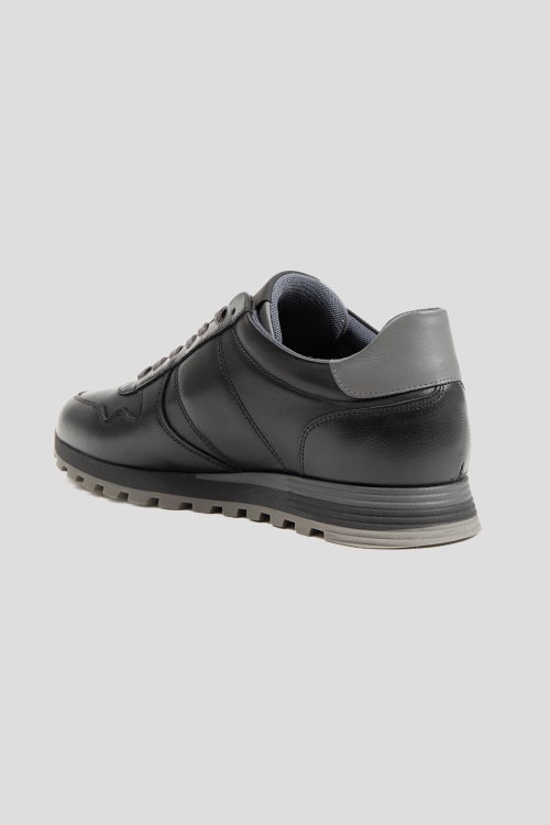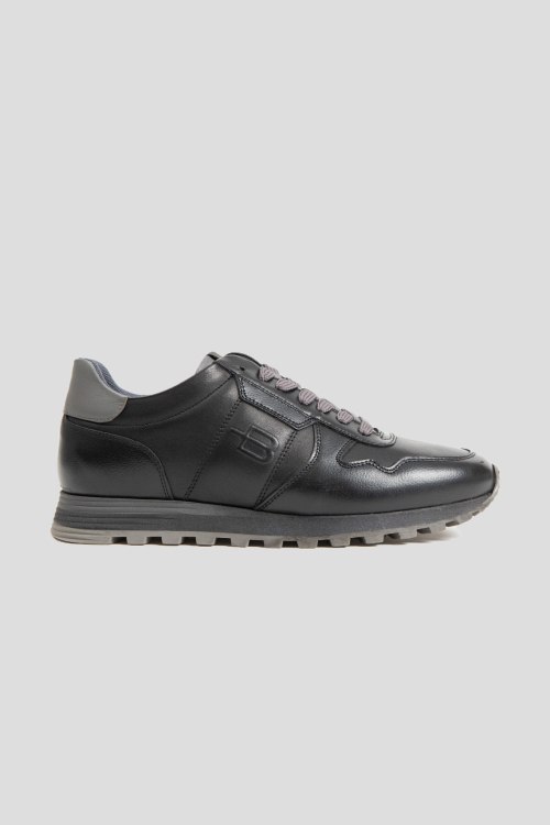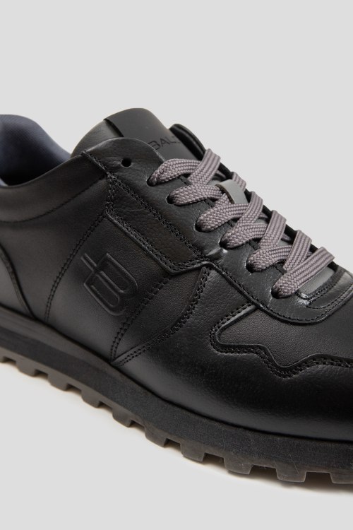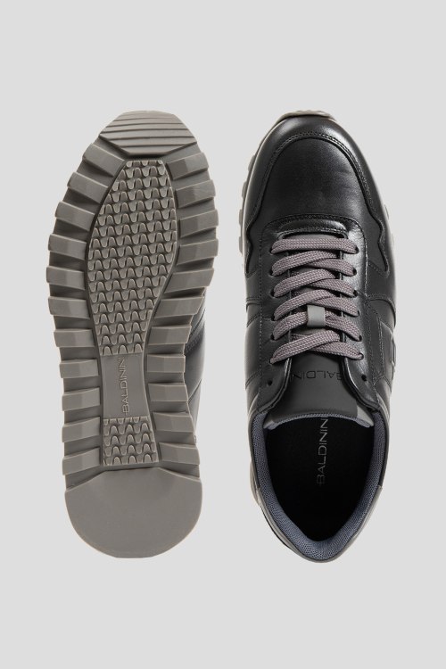 Детали: Мужские черные кроссовки из натуральной кожи от Baldinini (Балдинини). Закругленный носок, спереди классическая шнуровка серого цвета, патч-лого, рельефная подошва, кожаная стелька