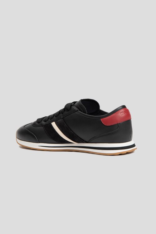 Детали: Мужские черные кожаные кроссовки от Bally (Балли). Модель из гладкой кожи, замшевая вставка, логотип сбоку и на пятке, классическая шнуровка, закругленный носок