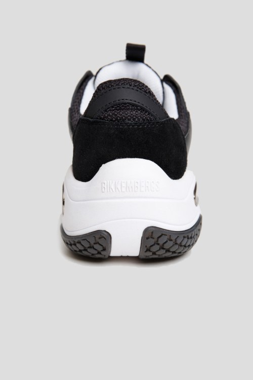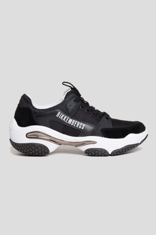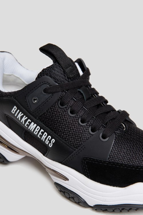 Детали: Мужские черные кроссовки из кожи и текстиля от Bikkembergs (Биккембергс). Комбинация материалов, рринт с логотипом сбоку, петля для подтягивания, классическая шнуровка, закругленный носок, резиновая подошва