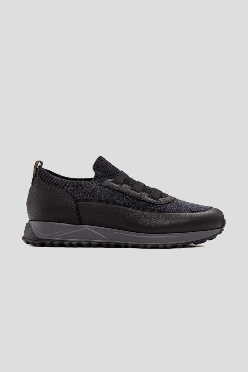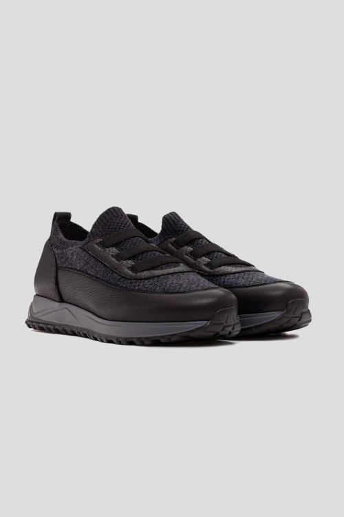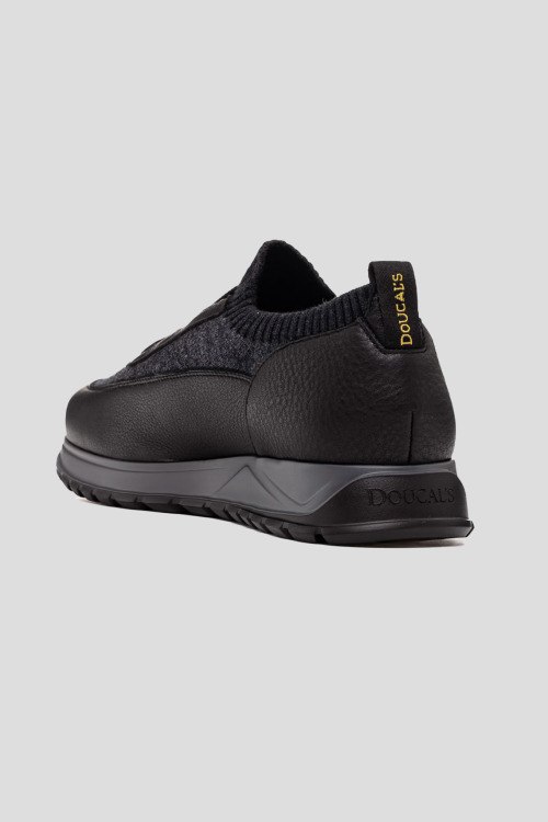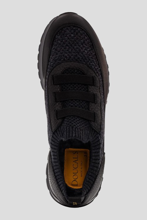 Детали: Мужские черные кроссовки из кожи и текстиля от Doucal's (Дукалс). Комбинация цветов и материалов, петля для подтягивания сзади, закругленный носок, кожаная стелька