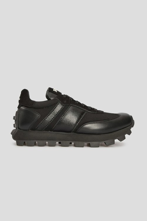 Детали: Мужские черные кроссовки из натуральной кожи и текстиля от Fabi (Фаби). Комбинированный дизайн, спереди классическая шнуровка, тракторная подошва, патч-лого