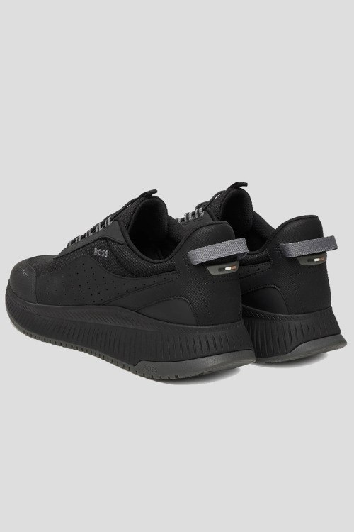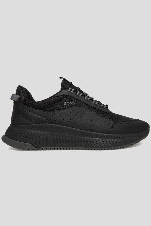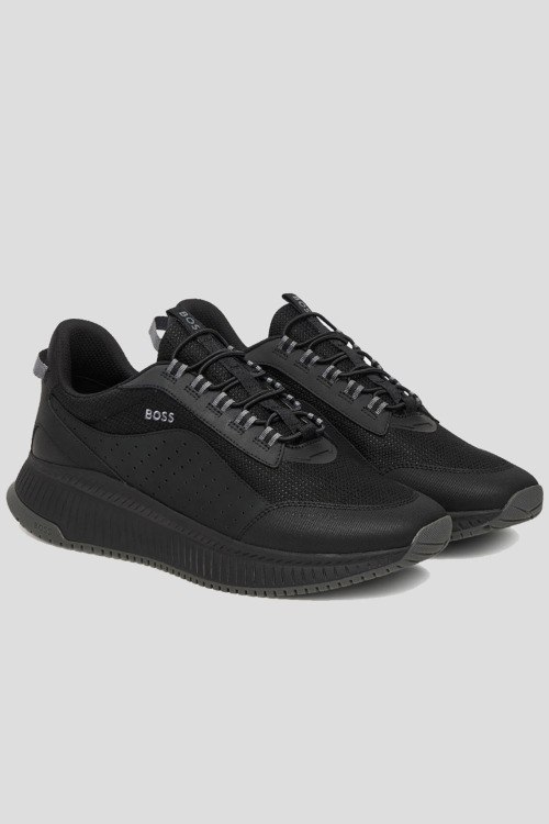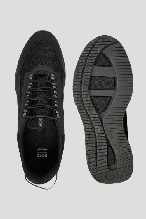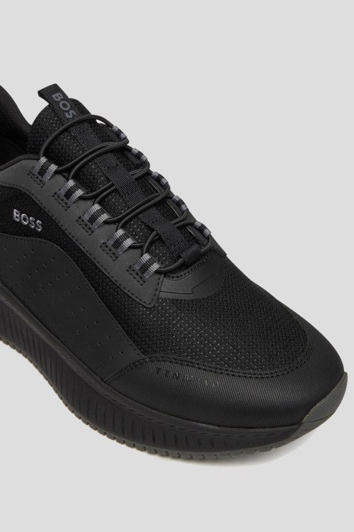 Детали: Мужские черные кроссовки из экокожи от Hugo Boss (Хуго Босс). Комбинированный дизайн, закругленный носок, спереди классическая шнуровка, петля для подтягивания, перфорированный дизайн