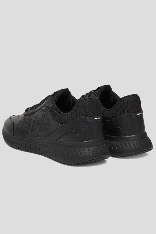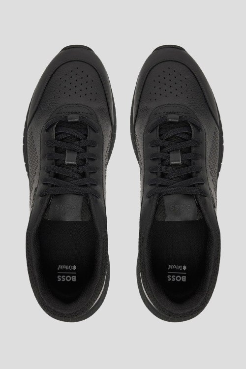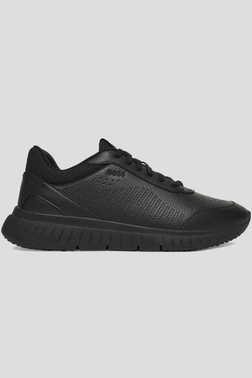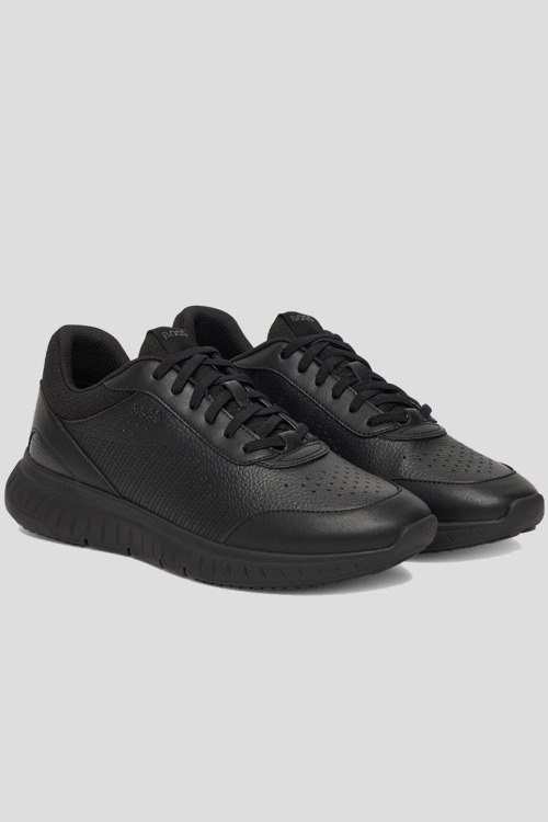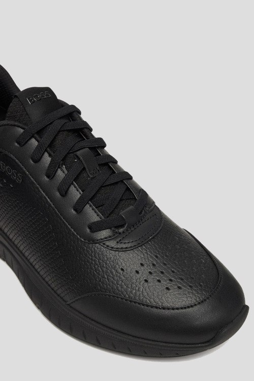 Детали: Мужские черные кожаные кроссовки Titanis от Hugo Boss (Хуго Босс). Модель из зернистой кожи, логотип сбоку и на язычке, классическая шнуровка, закругленный носок, черная подошва