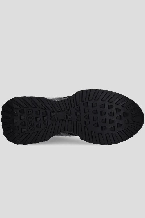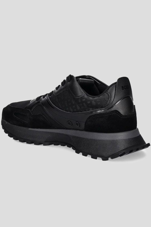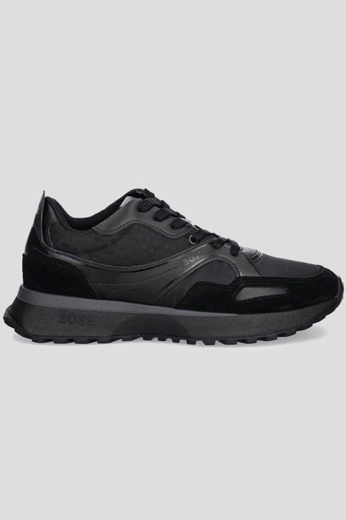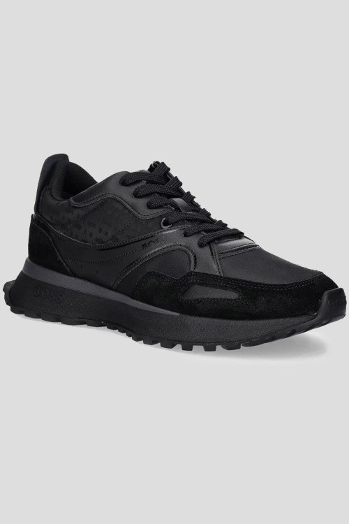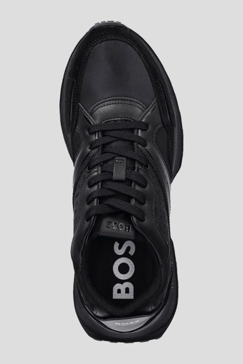 Детали: Мужские черные кроссовки из кожи и текстиля Jonah от Hugo Boss (Хуго Босс). Комбинация материалов, логотип сбоку и на язычке, классическая шнуровка, закругленный носок, ребристая подошва