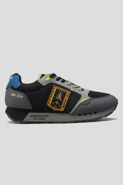 Детали: Мужские черно-серые кроссовки из текстиля и экозамши от Aeronautica Militare (Аэронавтика Милитари). Комбинация цветов и материалов, логотип сбоку и на язычке, классическая шнуровка, закругленный носок, брендированная подошва