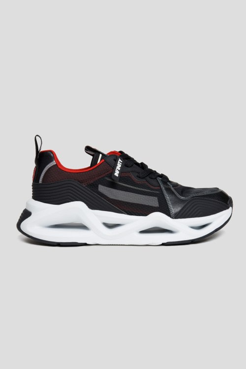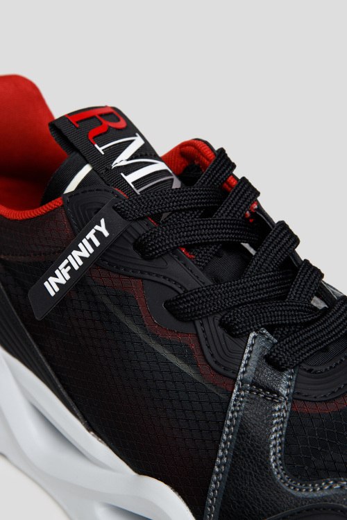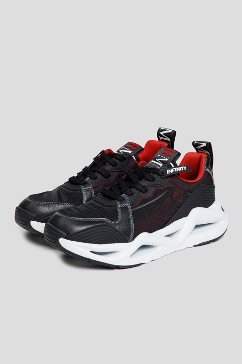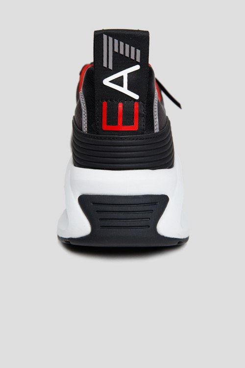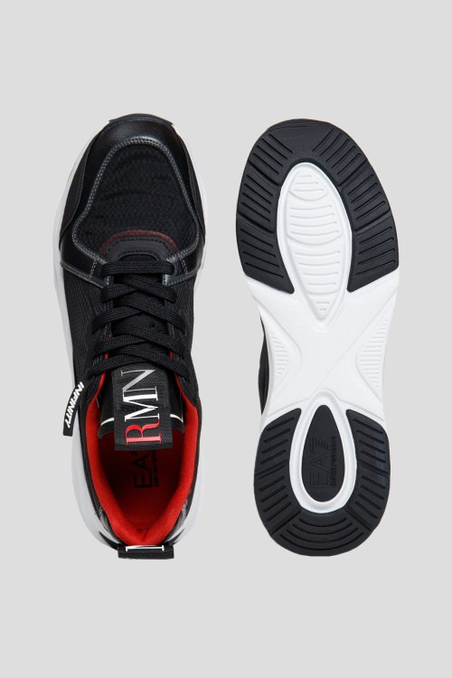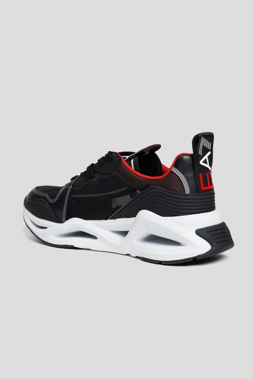 Мужские черные кроссовки из экокожи и текстиля от EA7 Emporio Armani (ЕА7 Эмпорио Армани). Закругленный носок, спереди классическая шнуровка, комбинация цветов, патч-лого, фигурная массивная подошва, петля для подтягивания