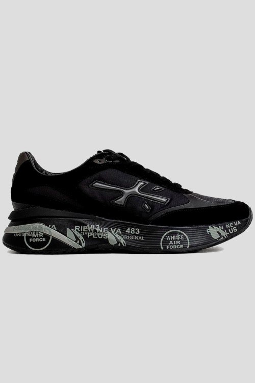 Детали: Мужские черные кроссовки из замши и текстиля Moerun от Premiata (Премиата). Комбинация материалов, логотип сбоку и на язычке, классическая шнуровка, закругленный носок, брендированная подошва