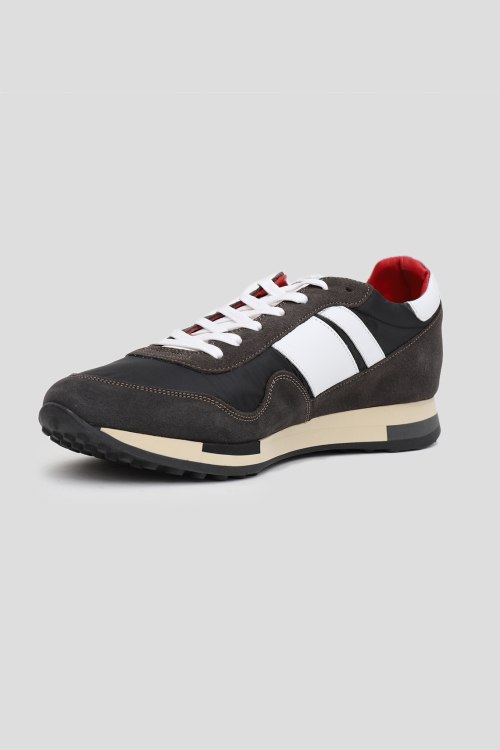 Мужские черно-коричневые текстильные кроссовки от Quattrobarradodici (Кватроберадодичи). Замшевые вставки, контрастные кожаные вставки, нашивка с логотипом на язычке, классическая шнуровка, закругленный носок