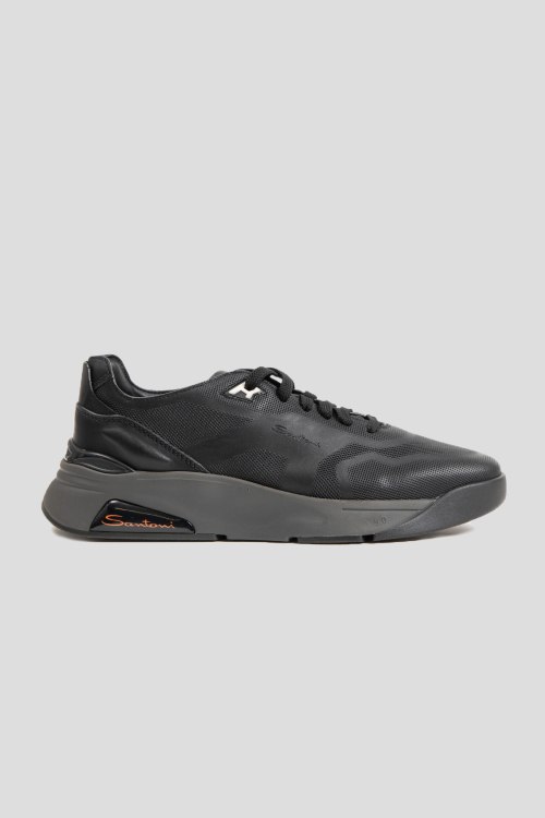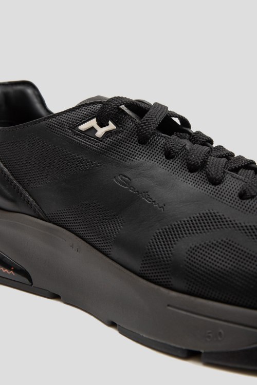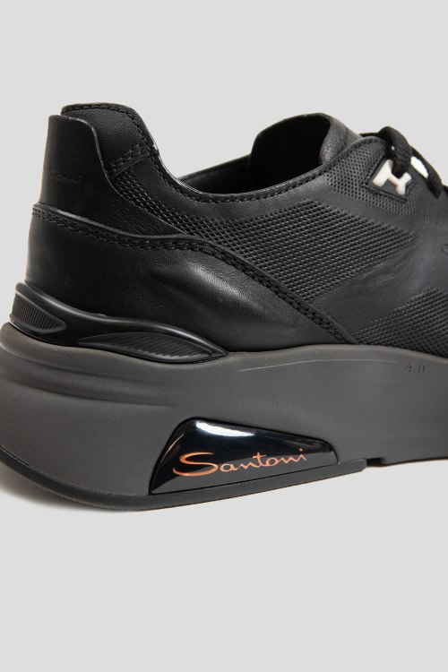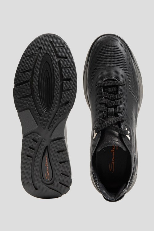 Детали: Мужские черные кроссовки из натуральной кожи от Santoni (Сантони). Закругленный носок, перфорированный дизайн, спереди классическая шнуровка, резиновая подошва, логотип бренда