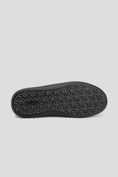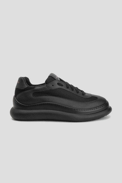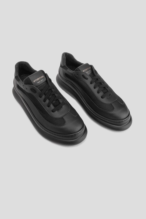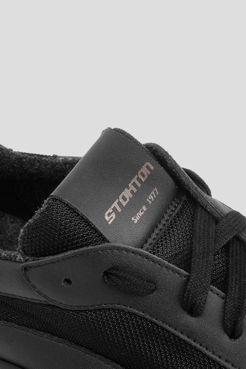 Мужские черные кроссовки из кожи и текстиля от Stokton (Стоктон). Комбинация материалов, логотип на пятке и на язычке, классическая шнуровка, закругленный носок, черная подошва