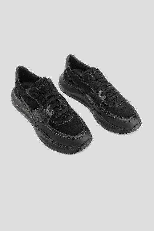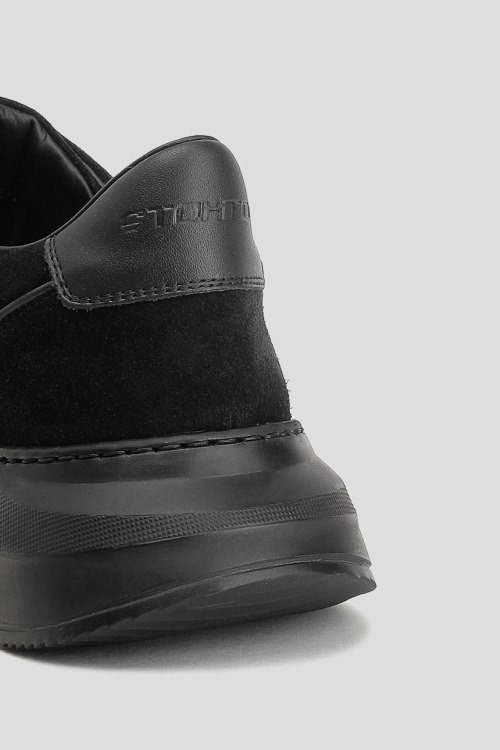 Детали: Мужские черные кроссовки из замши и кожи от Stokton (Стоктон). Комбинация материалов, тиснение логотипа на язычке, классическая шнуровка, закругленный носок