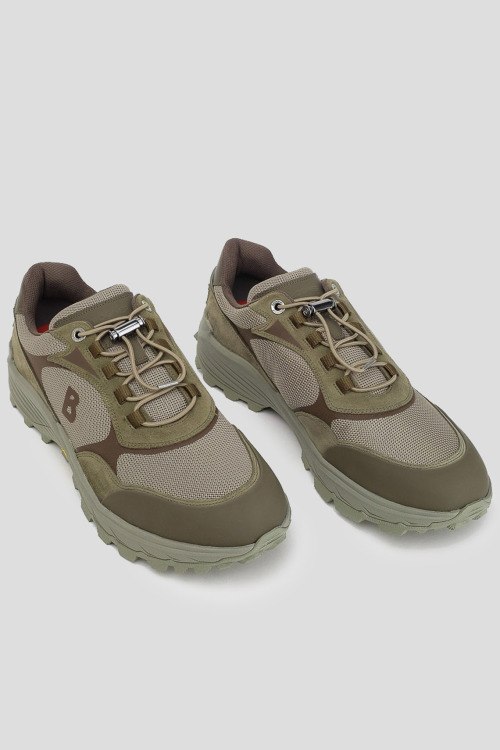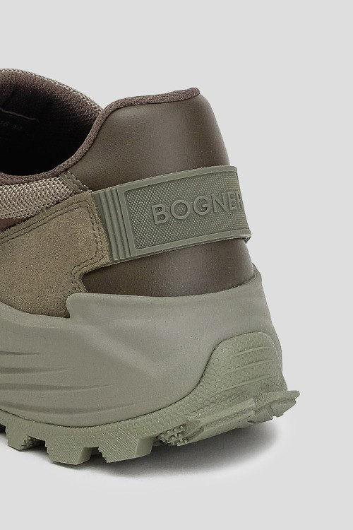 Детали: Мужские кроссовки цвета хаки из замши и текстиля Hike Pro от Bogner (Богнер). Комбинация материалов, логотип сбоку и на язычке, классическая шнуровка с фиксатором, закругленный носок, подошва Vibram