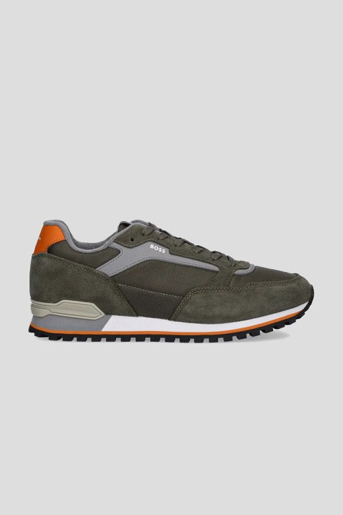 Детали: Мужские кроссовки Parkour цвета хаки из полиэстер и замши от Hugo Boss (Хуго Босс). Комбинация материалов, спереди классическая шнуровка, патч-лого, рельефная подошва