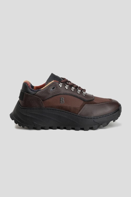 Мужские коричневые кроссовки из кожи и текстиля Sheffield от Bogner (Богнер). Комбинация материалов, логотип сбоку и на язычке, классическая шнуровка, закругленный носок, массивная подошва