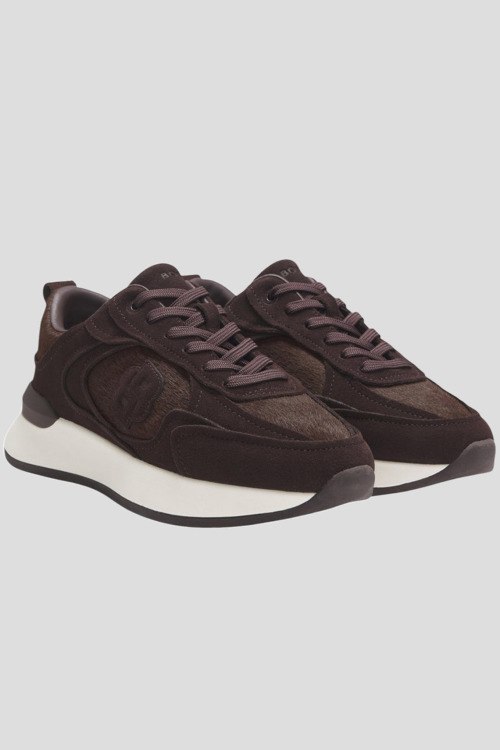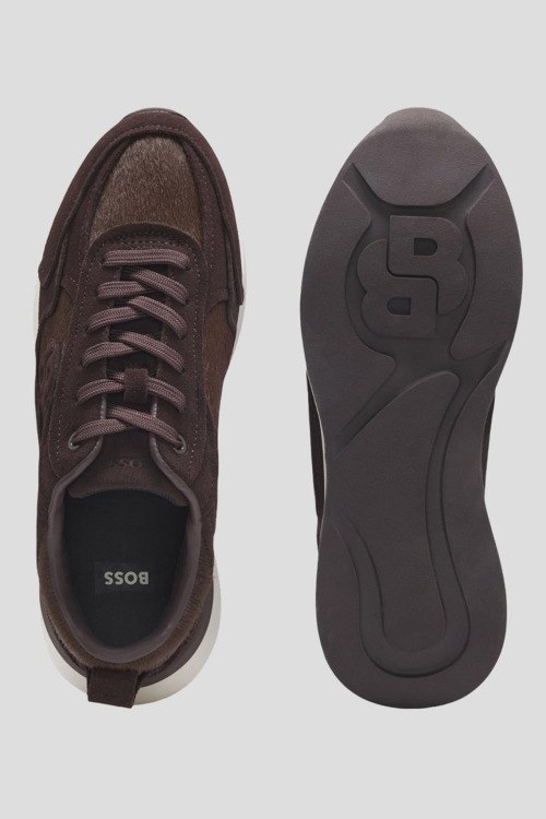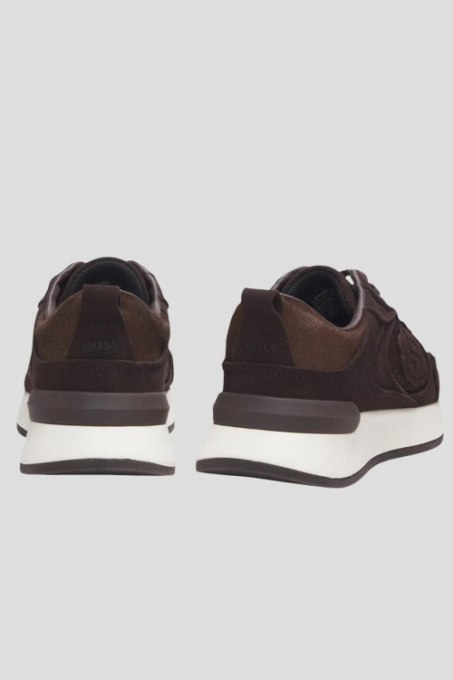Детали: Мужские коричневые кроссовки из экокожи и замши от Hugo Boss (Хуго Босс). Комбинация материалов, закругленный носок, спереди классическая шнуровка, патч-лого