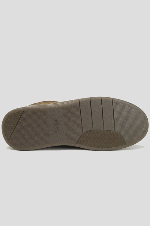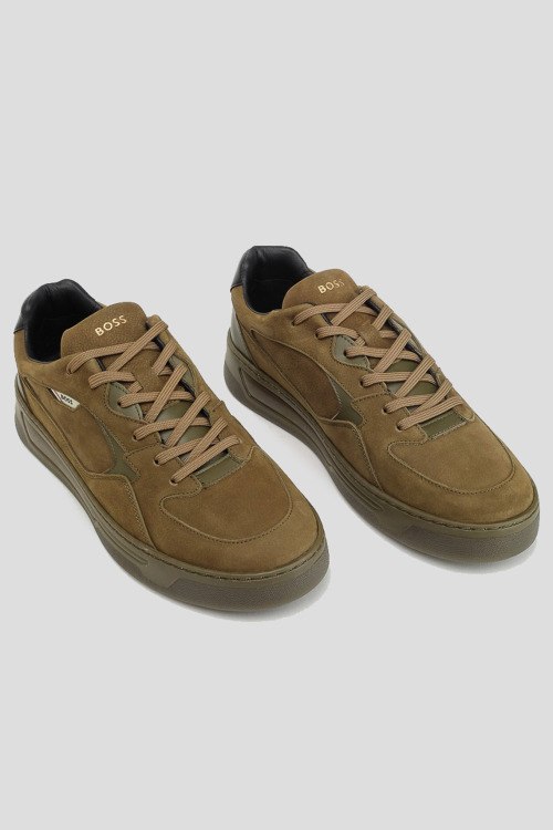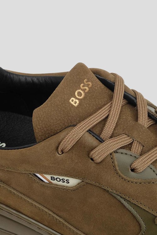 Детали: Мужские светло-коричневые замшевые кроссовки Baltimore от Hugo Boss (Хуго Босс). Кожаные вставки, логотип сбоку и на язычке, классическая шнуровка, закругленный носок, резиновая подошва