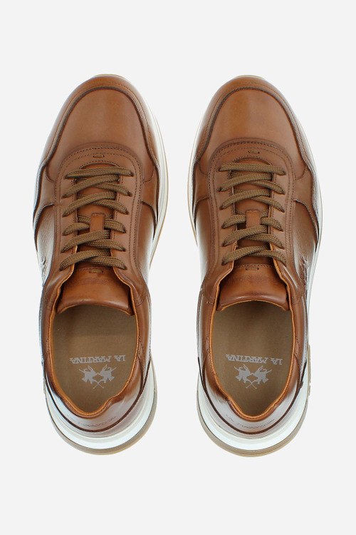Детали: Мужские коричневые кожаные кроссовки от La Martina (Ла Мартина). Модель из гладкой кожи, логотип сбоку и на язычке, классическая шнуровка, закругленный носок, белая подошва