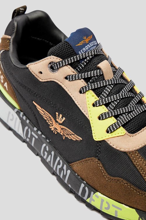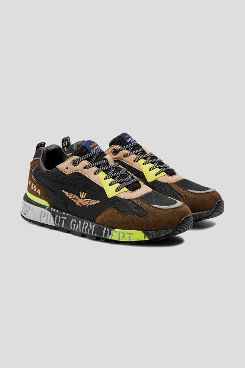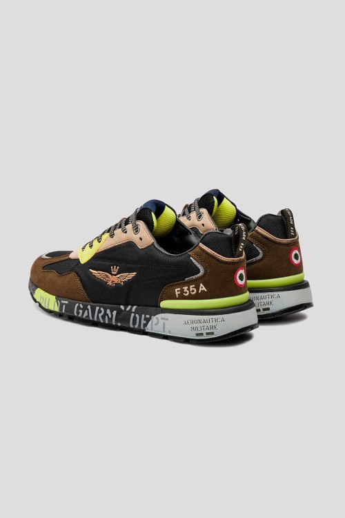 Мужские коричневые кроссовки из замши и текстиля от Aeronautica Militare (Аэронавтика Милитари). Комбинированный дизайн, закругленный носок, спереди классическая шнуровка, вышитый логотип бренда, патч-лого, петля для подтягивания. р.46 - 29 см