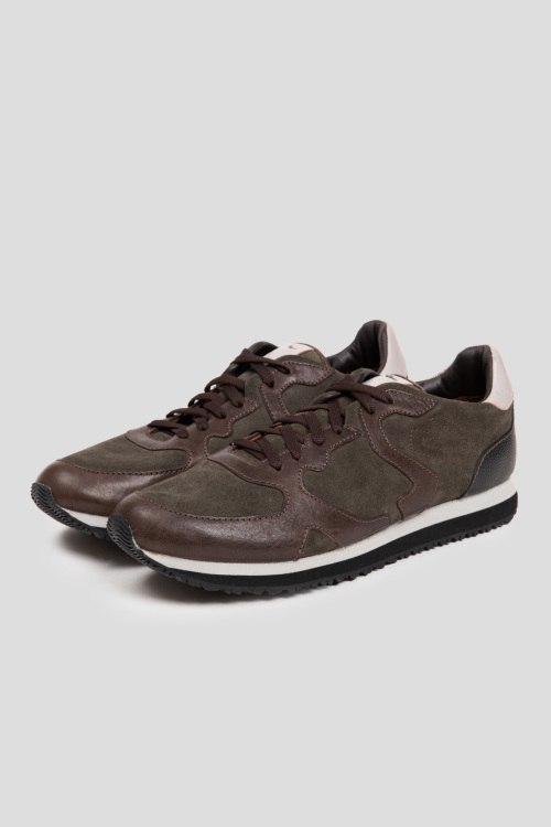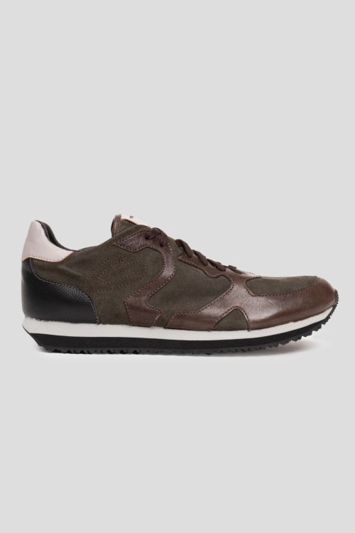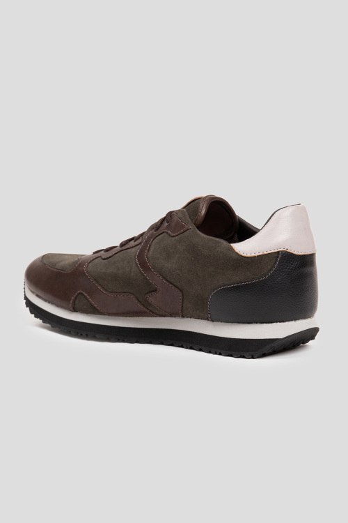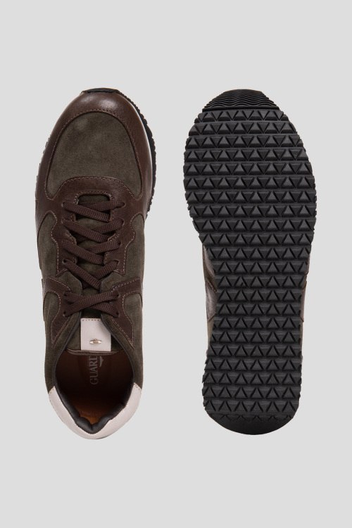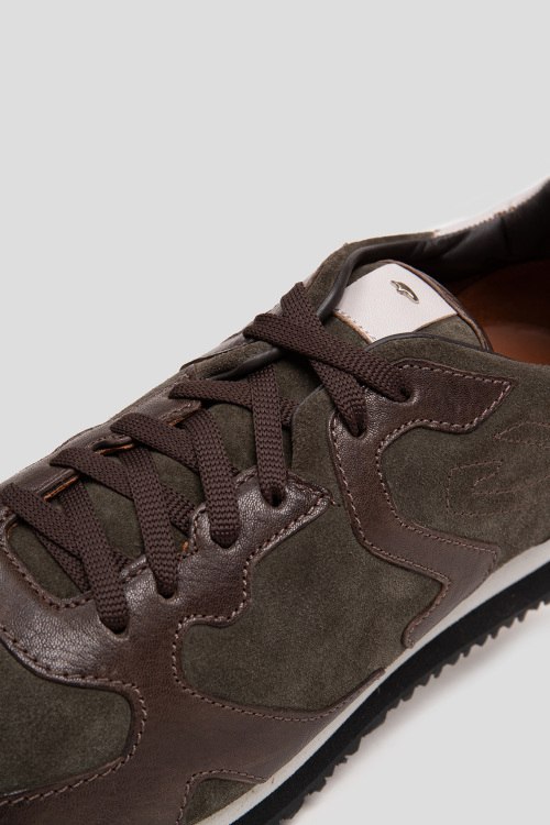 Детали: Мужские коричнево-зеленые кроссовки из кожи и замши от Alberto Guardiani (Альберто Гуардиани). Комбинация цветов и материалов, логотип на язычке, классическая шнуровка, закругленный носок