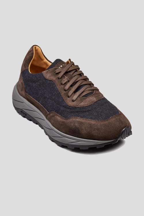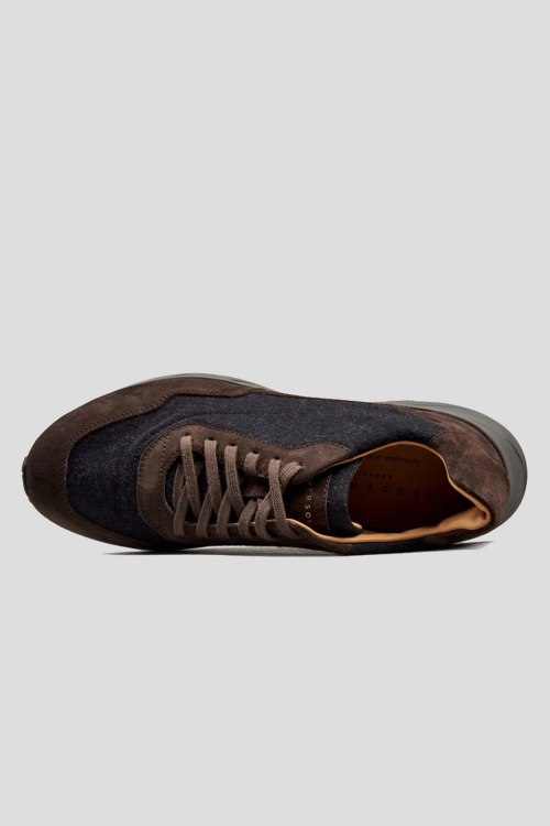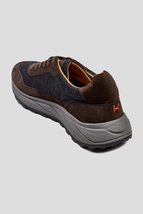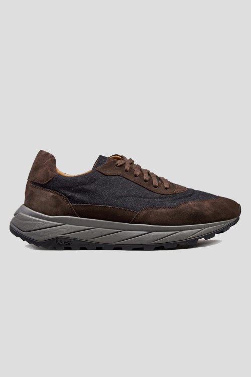 Детали: Мужские коричнево-серые кроссовки из замши и текстиля от Henderson Baracco (Хендерсон Баракко). Комбинация цветов и материалов, логотип на язычке, классическая шнурвока, закругленный носок, кожаная стелька