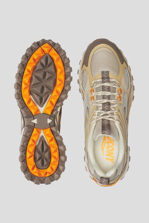 Детали: Мужские коричневые кроссовки Grid Aura X из текстиля от Saucony (Сайкони). Дизайн в виде комбинации цветов и материалов, закругленный носок, спереди классическая шнуровка, патч-лого, петля для подтягивания