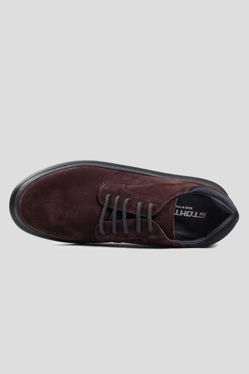 Детали: Мужские темно-коричневые замшевые кроссовки от Stokton (Стоктон). Классическая шнуровка, тиснение логотипа на язычке, закругленный носок, кожаная стелька