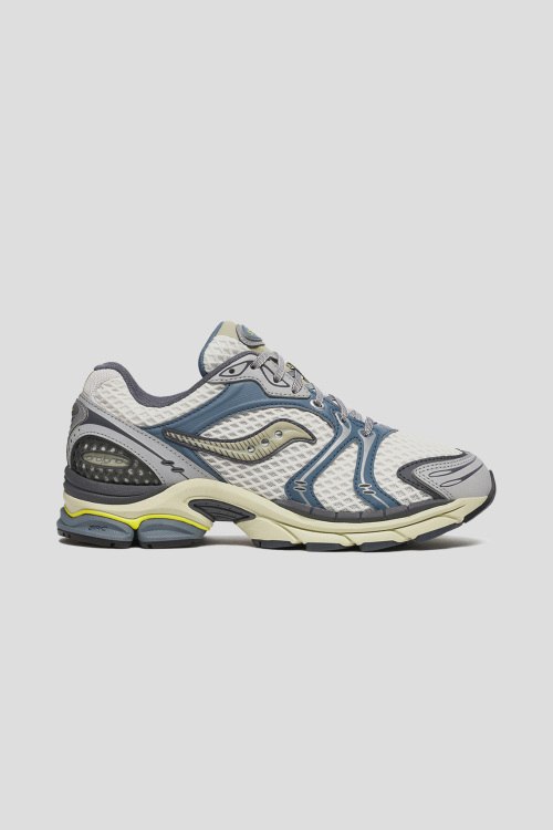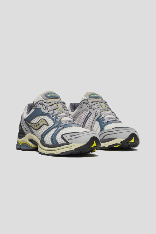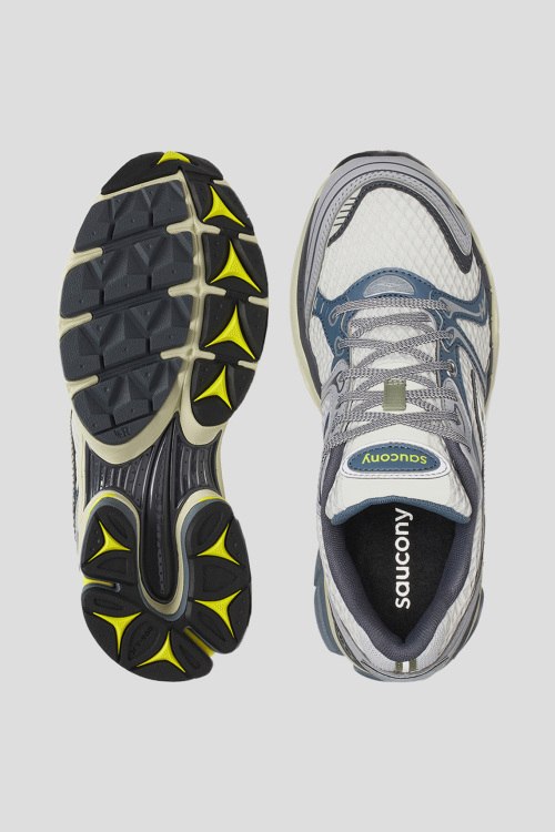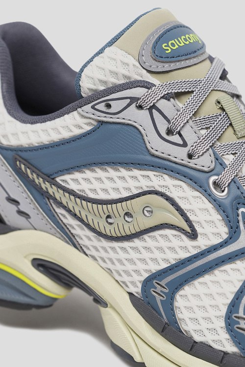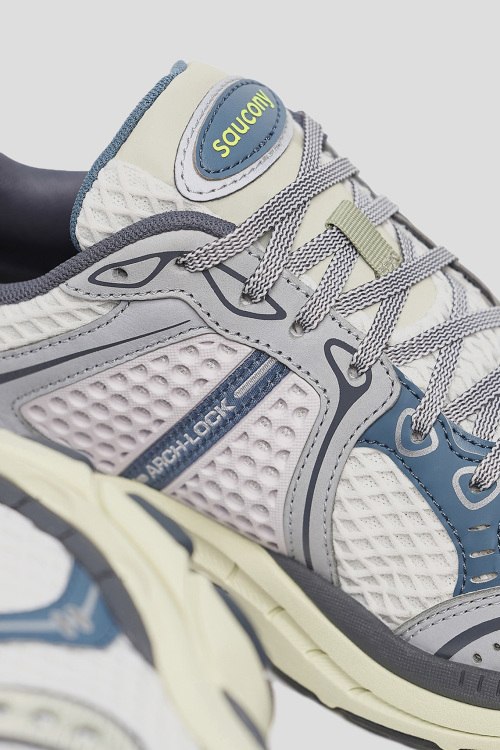 Детали: Мужские бело-синие кроссовки Grid Aura X от Saucony (Сайкони). СЕтчатые вставки, комбинация цветов и материалов, закругленный носок, спереди классическая шнуровка, патч-лого, резиновая подошва