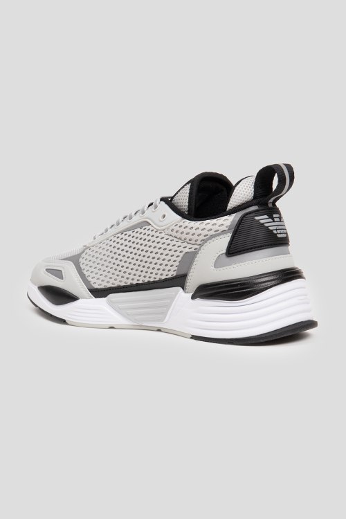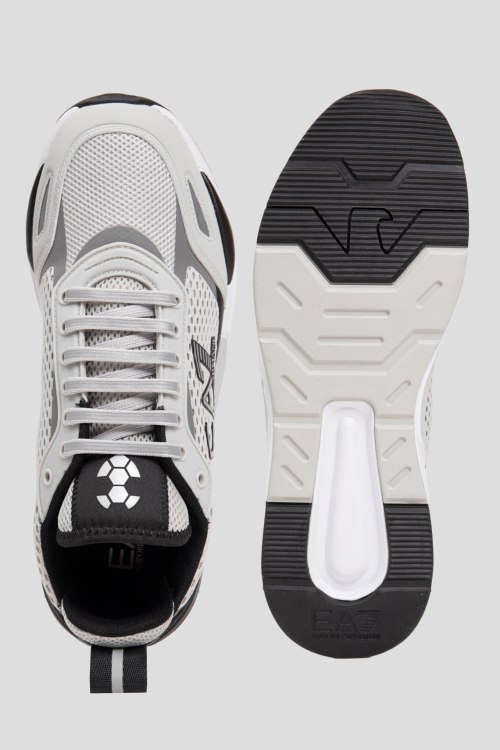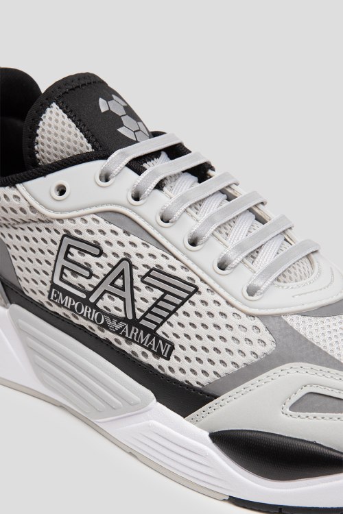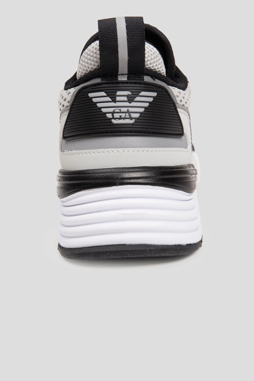 Детали: Мужские светло-серые текстильные кроссовки от Emporio Armani (Эмпорио Армани). Комбинация материалов, логотип сбоку и на язычке, классическая шнуровка, петля для подтягивания сзади, закругленный носок, резиновая подошва