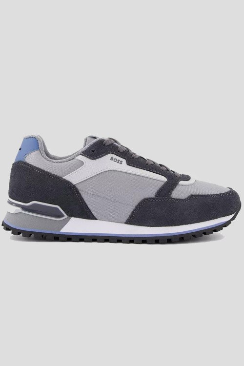 Детали: Мужские серые кроссовки из замши и текстиля Parkour от Hugo Boss (Хуго Босс). Комбинация материалов, логотип сбоку и на язычке, классическая шнуровка, закругленный носок, ребристая подошва