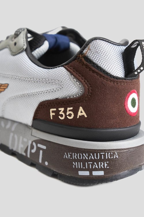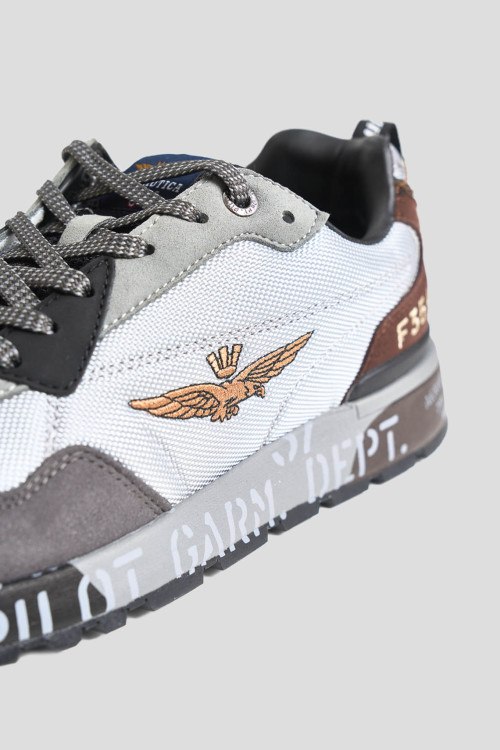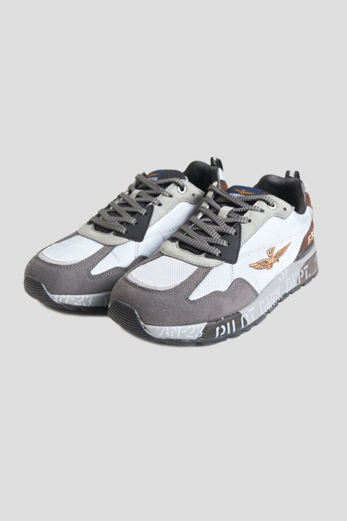 Детали: Мужские серо-белые кроссовки из полиэстера и замши от Aeronautica Militare (Аэронавтика Милитари). Дизайн в виде комбинации цветов и материалов, закругленный носок, спереди шнуровка, патч-лого, рельефная подошва