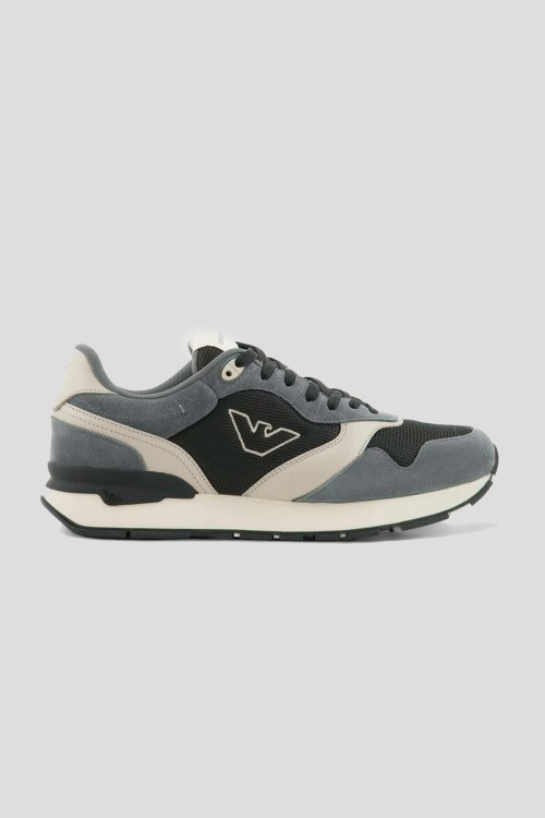 Мужские серо-черные кроссовки из замши и текстиля от Emporio Armani (Эмпорио Армани). Комбинация цветов и материалов, логотип сбоку и на язычке, классическая шнуровка, закругленный носок