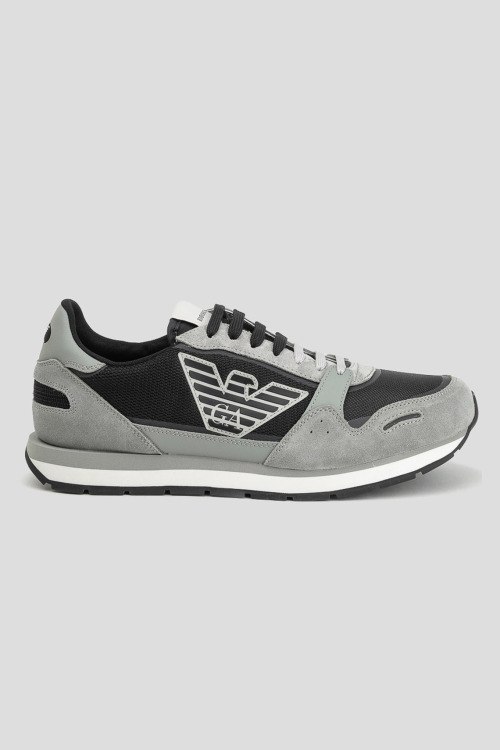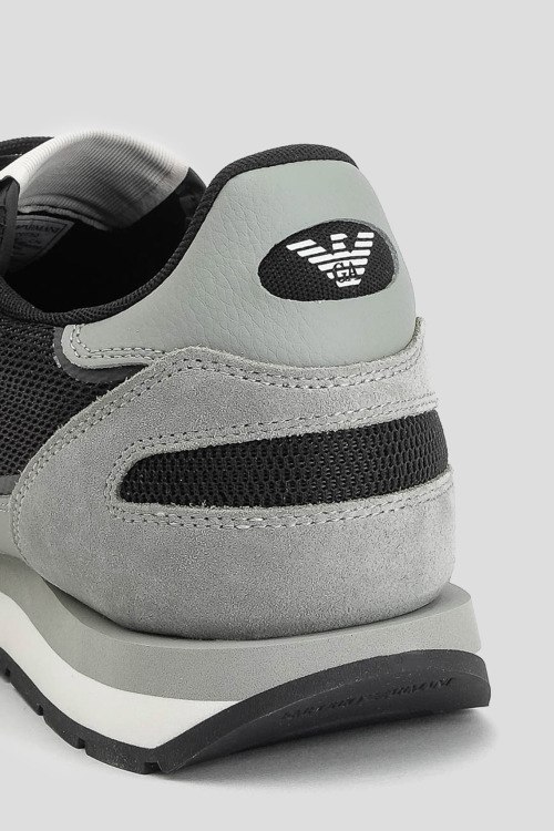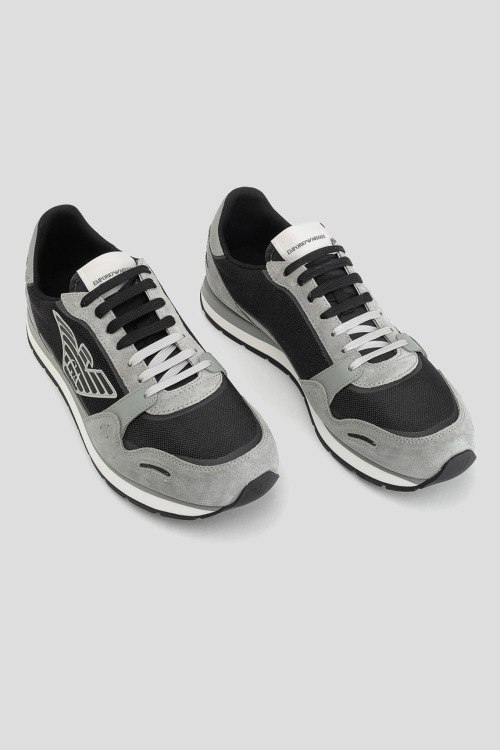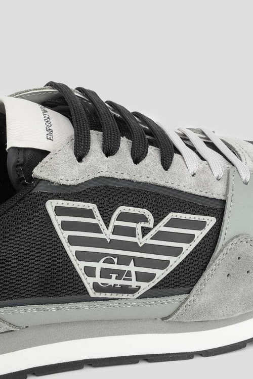 Детали: Мужские черно-серые кроссовки из текстиля и замши от Emporio Armani (Эмпорио Армани). Дизайн в виде комбинации цветов и материалов, закругленный носок, спереди шнуровка, патч-лого, рельефная подошва